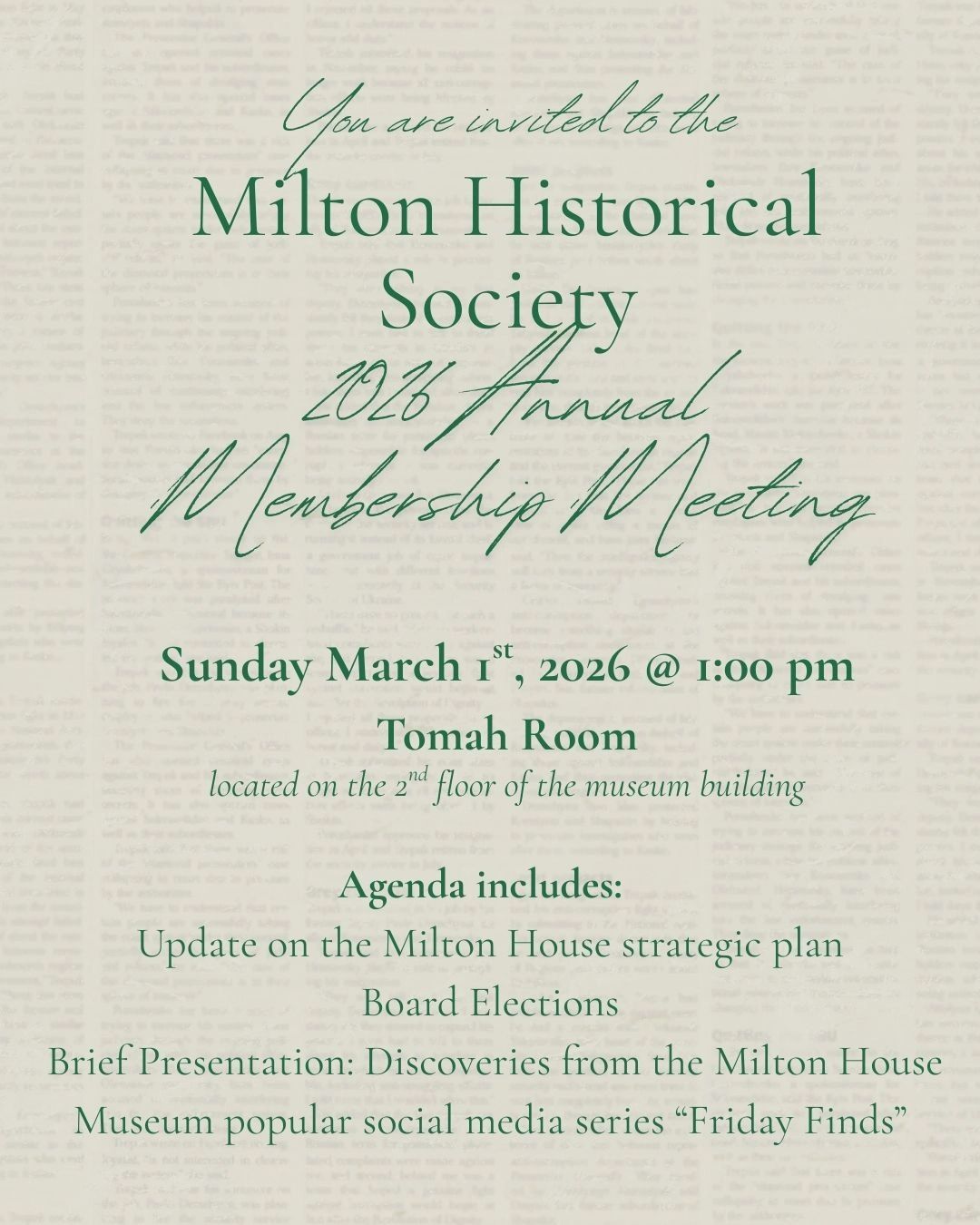Please Note: You must be a current member of the Milton Historical Society to attend this meeting. To renew your membership or to become a member, please click the link below.